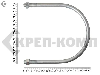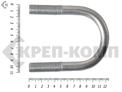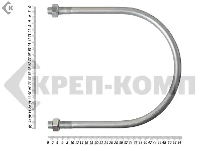 Хомут U-образный представляет собой изогнутый по определенному диаметру трубы стержень, концы которого снабжены метрической резьбой. Предназначен для фиксации труб при монтаже коммуникационных сетей. С его помощью можно производить эффективное закрепление к рабочему основанию стержней, электротехнического силового кабеля и прочих изделий круглого сечения. Жесткая фиксация реализуется за счет затягивания гаек на резьбовых концах стержня.